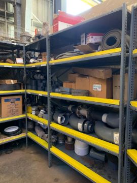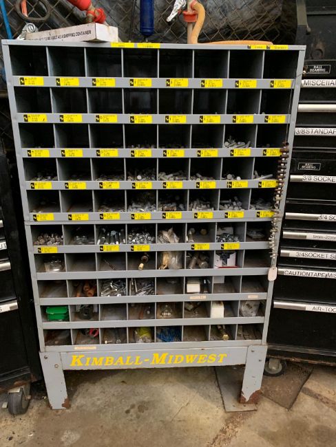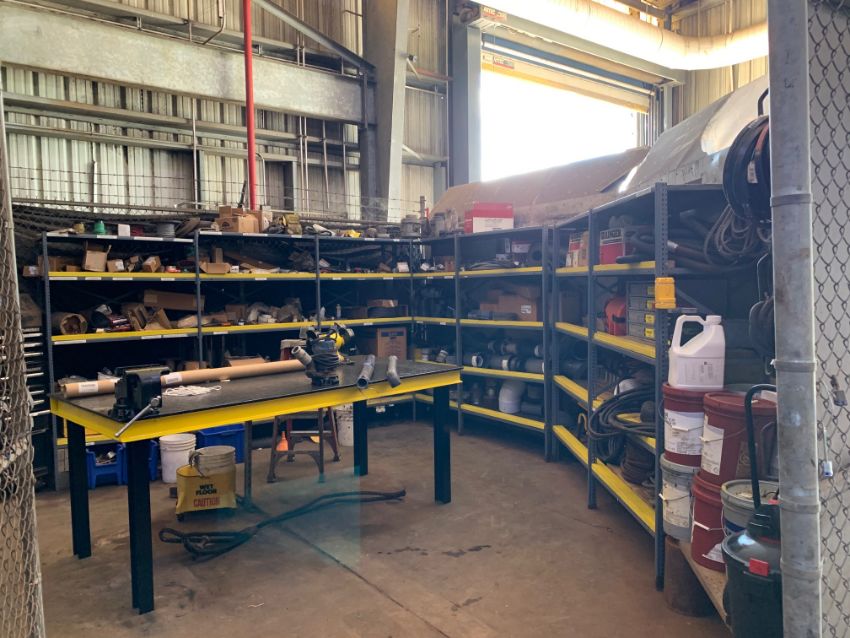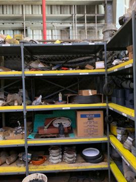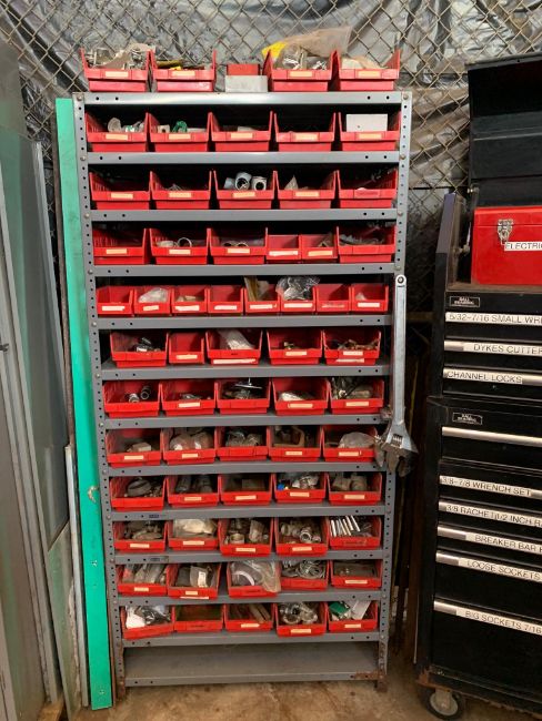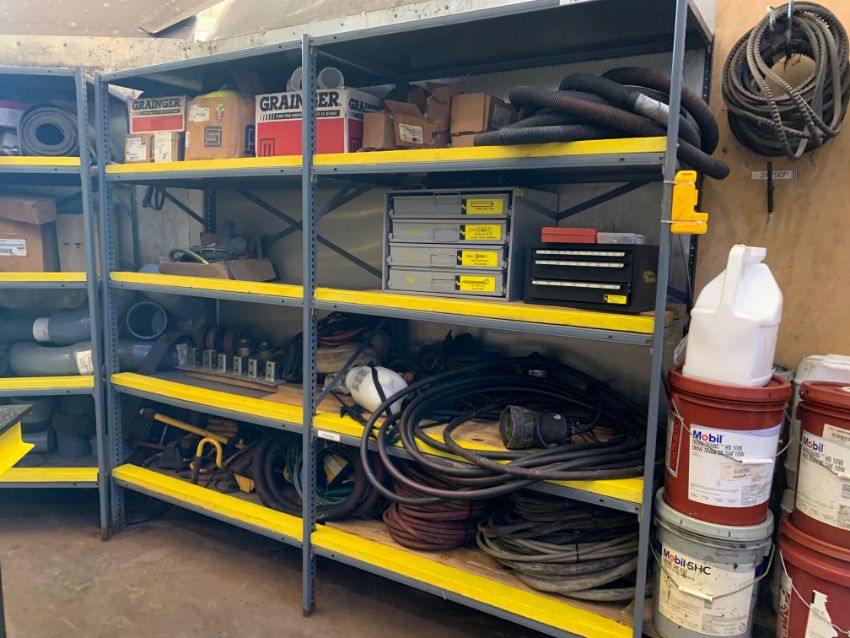 All remaining parts, supplies, and racking in tool crib area including (2) pigeon hole cabinets, and all assorted HD shelving with all parts