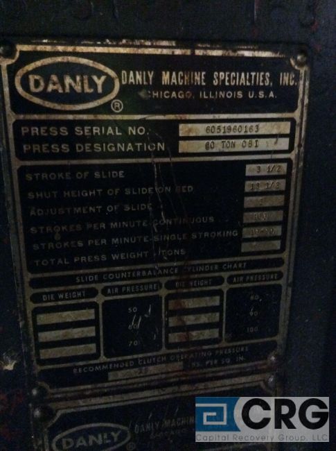 Danly 60:ton press with air clutch, sn 6051960163, 3 1/2 inch stroke, 13 1/2 inch shut height, with 3 adjustment, 100 stroke per minute (LOCATED ON 1ST FLOOR PRODUCTION AREA) - RIGGING FEE: $850.00-WILL AUTOMATICALLY BE ADDED TO THE INVOICE