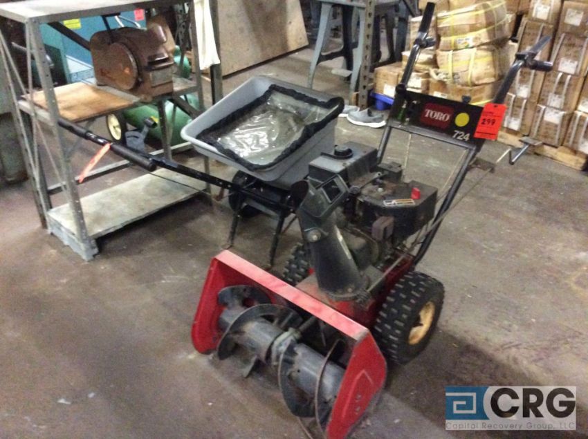 Toro snowblower, 24 inch throat, 7 HP gas engine and (1) broadcast spreader (LOCATED INSIDE TOOL ROOM) - RIGGING FEE: $25.00-WILL AUTOMATICALLY BE ADDED TO THE INVOICE