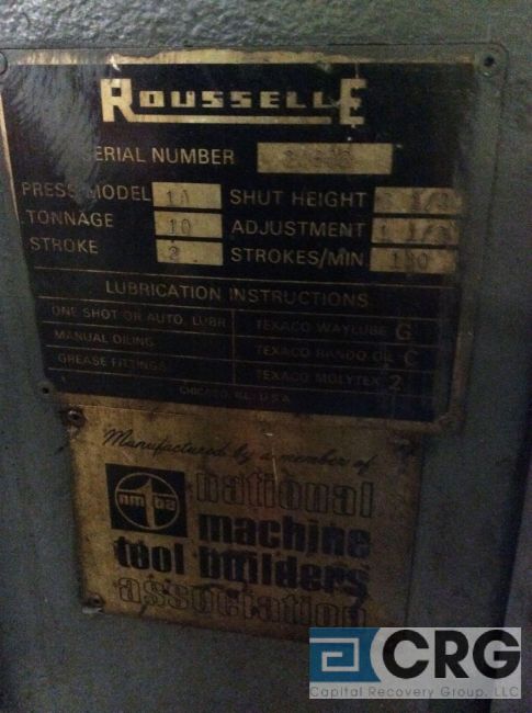 Rousselle 1A 10 ton punch press, sn 20662, 2 inch stroke, 6 1/4 inch shut height, 1 1/2 inch adjustment, 180 strokes per minute, 200 stroke flywheel (LOCATED ON 1ST FLOOR PRODUCTION AREA) - RIGGING FEE: $250.00-WILL AUTOMATICALLY BE ADDED TO THE INVOICE