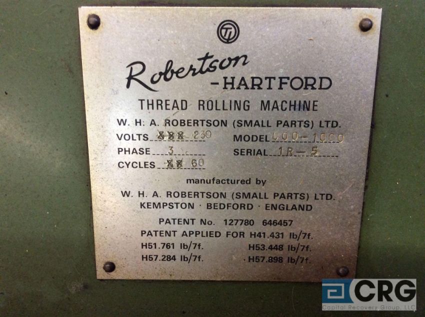 Robertson – Hartford model 000-1000 thread roller, s/n 1R-5, 1/8 max thread dia, 1” max thread and shank length, 350 – 1000 PPM with rotary feeder (LOCATED ON 1ST FLOOR PRODUCTION AREA) - RIGGING FEE: $650.00-WILL AUTOMATICALLY BE ADDED TO THE INVOICE
