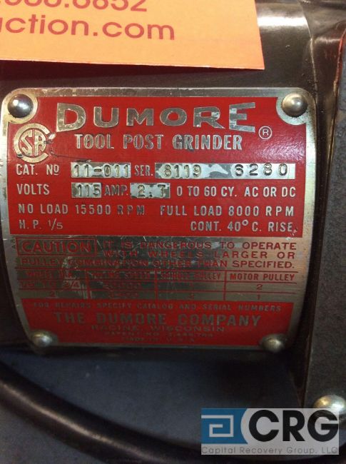 Dumore tool post grinder, mn 11-011, 1/5 HP, 1 phase with steel case (LOCATED IN TOOL ROOM MACHINE SHOP) - RIGGING FEE: $50.00-WILL AUTOMATICALLY BE ADDED TO THE INVOICE