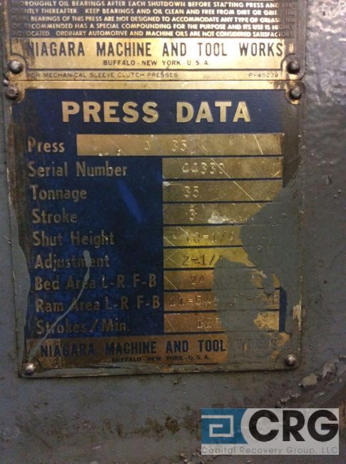 Niagara A35 35 ton punch press, sn 44330, 3 inch stroke, 10 1/4 inch shut height, 2 1/4 inch adjustment, 128 strokes per minute, 120 stroke per minute flywheel at 3 inch slide (LOCATED ON 1ST FLOOR PRODUCTION AREA) - RIGGING FEE: $850.00-WILL AUTOMATICALLY BE ADDED TO THE INVOICE
