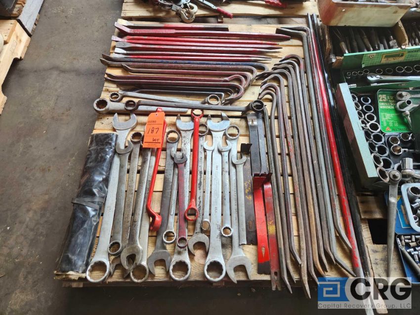 Lot of asst crow bars, pinch bars and large open face wrenches