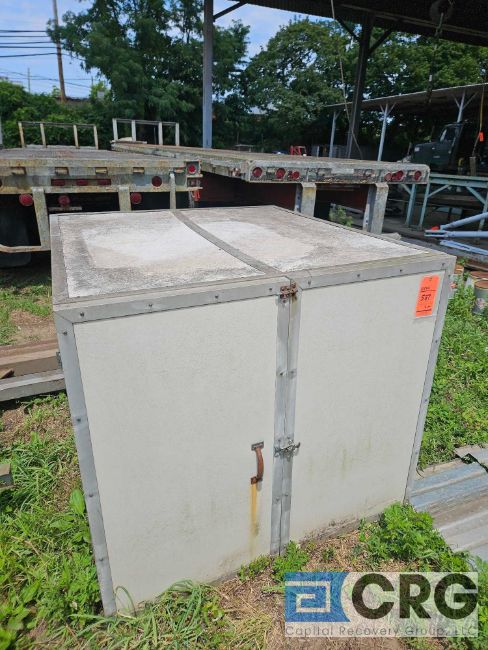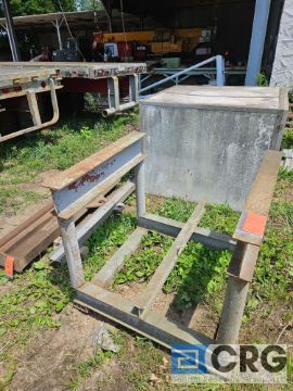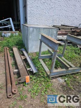 Lot of assorted (1) steel structure lifting table, (2) lifting spreaders, (2) tow bars and (1) insulated storage cabinet
