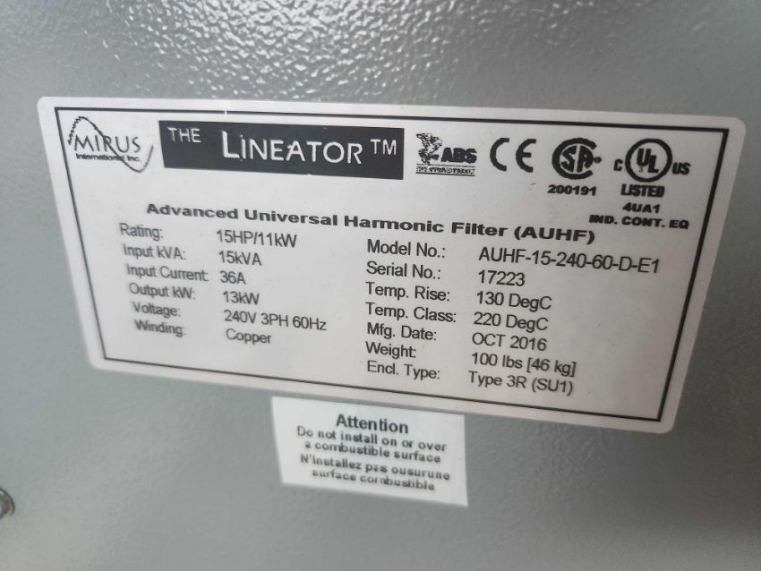 Mirus advanced universal harmonic filter (Omniverter), mn AUHF-15-240-60-0-E1, sn 17223, 15 kva, 240 volts, 3 phase