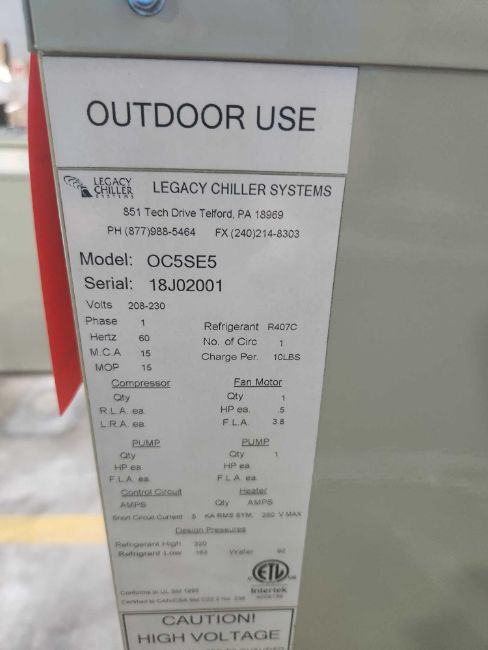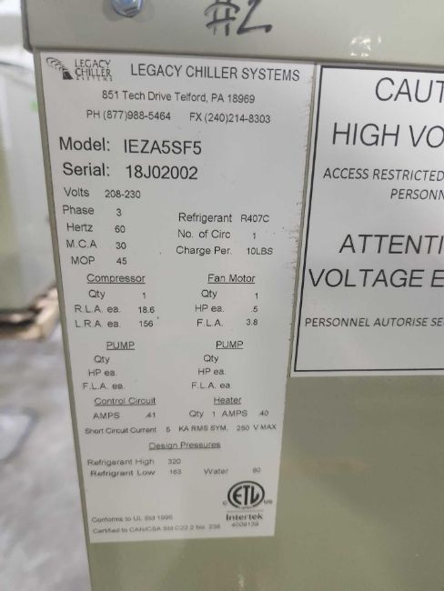 Legacy Chiller mn IEZA5SF5, sn 18J02002, and Condenser mn OC5SE5, sn 18J2001, 208-230 volts, 3 phase, R407C refrigerant
