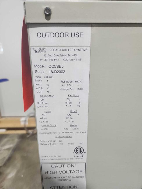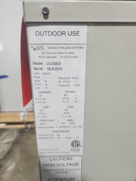 Legacy Chiller mn IEZA5SF5, sn 18J02000, and Condenser mn OC5SE5, sn 18J2003, 208-230 volts, 3 phase, R407C refrigerant