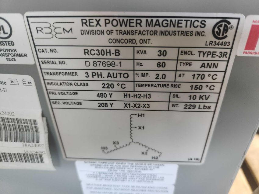 Rex Power Magnetics transformer, part number RC30H-B, 30 kva, 480 volt, 3 phase (blown fuse)