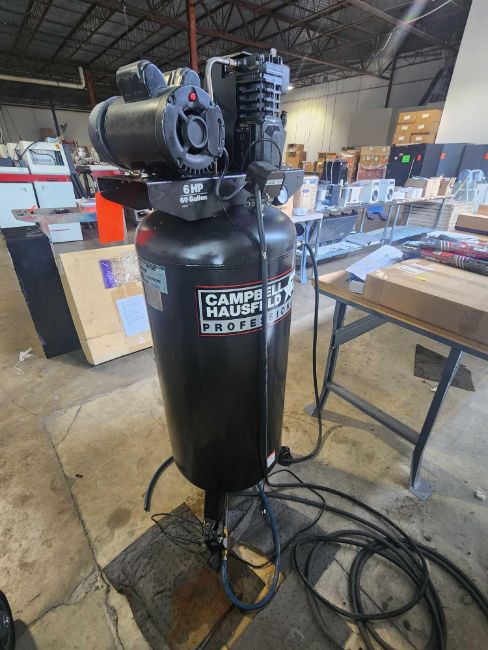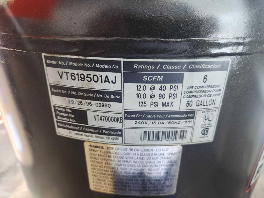 Campbell Hausfeld vertical 60 gallon air compressor, 6 hp, 125 max psi