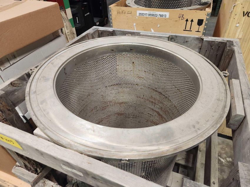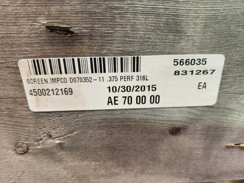Impco screen, 11.375 mm perf., approx 38 5/8 X 43 1/4 X 28 7/8 I.D. 316L, (BACK LEFT CORNER) [Lot loading fee of $25 per pallet applies. Total fee of $25 will be added to your invoice.]