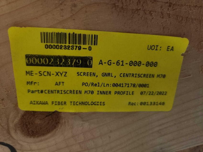 AFT/Aikana screen, M70 CENTRISCREEN inner profile, .008 perf. 6-slots per inch, approx 35.812 inch I.D. X 43.505 inch tall, (AG6100) [Lot loading fee of $25 per pallet applies. Total fee of $25 will be added to your invoice.]