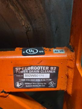 General Speedrooter 92 power drain cleaner, 1/2 inch electric snake m/n 92, s/n S92WS0171, v-belt stair climber, max cable length 200 feet, (WALLINGFORD) Asset # 543-09
