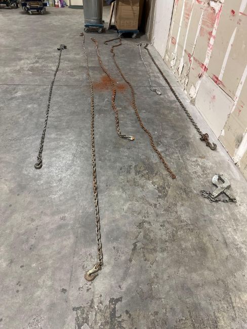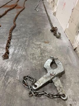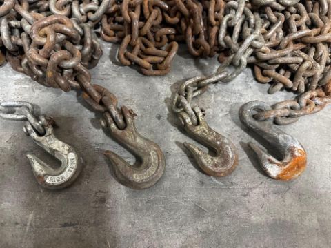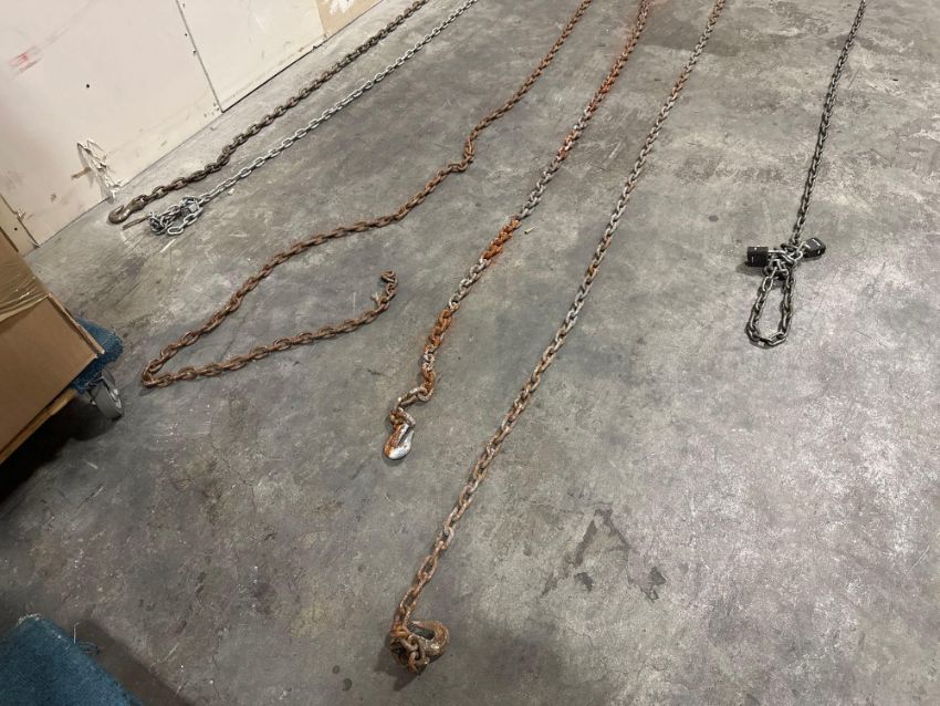 Lot of assorted lifting chain and accessories, including (3) double sided lifting chains, (2) single sided, (1) length of heavy chain, and 2000lb cap lifting jaw (chain length 10ft to 19ft) (616 Corporate Way Suite 2 Valley Cottage NY)