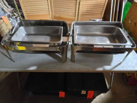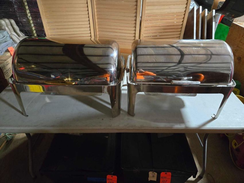 Lot of (2) assorted roll top sterno chafing dishes with protective box, (1) with gold handle, (1) silver handle